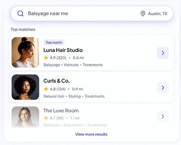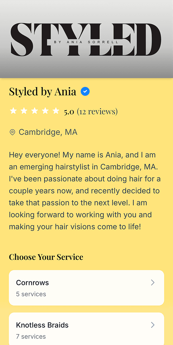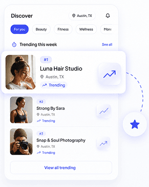 Your profile appears on Foundri's Discover page, where customers in your city search by style, price, and availability. No ads needed.